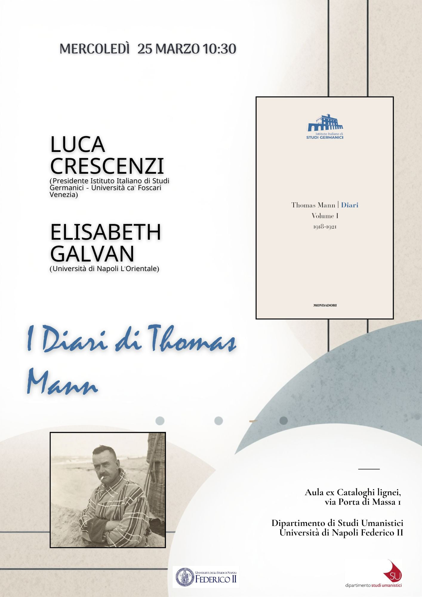 Mercoledì 25 marzo, alle ore 10.30 nell’aula ex Cataloghi lignei (Porta di Massa), avrà luogo la presentazione del primo volume (1918-1921) dei Diari di Thomas Mann, pubblicato dall’Istituto Italiano di Studi Germanici e distribuito da Mondadori. Saranno presenti i curatori Luca Crescenzi (Presidente dell’Istituto Italiano di Studi Germanici – Università Ca’ Foscari di Venezia) ed Elisabeth Galvan (Università degli Studi di Napoli “L’Orientale”). Introduce Luca Zenobi (Università degli Studi di Napoli “Federico II”).
